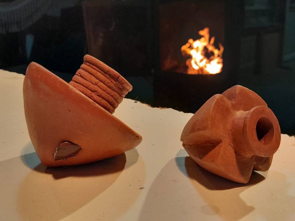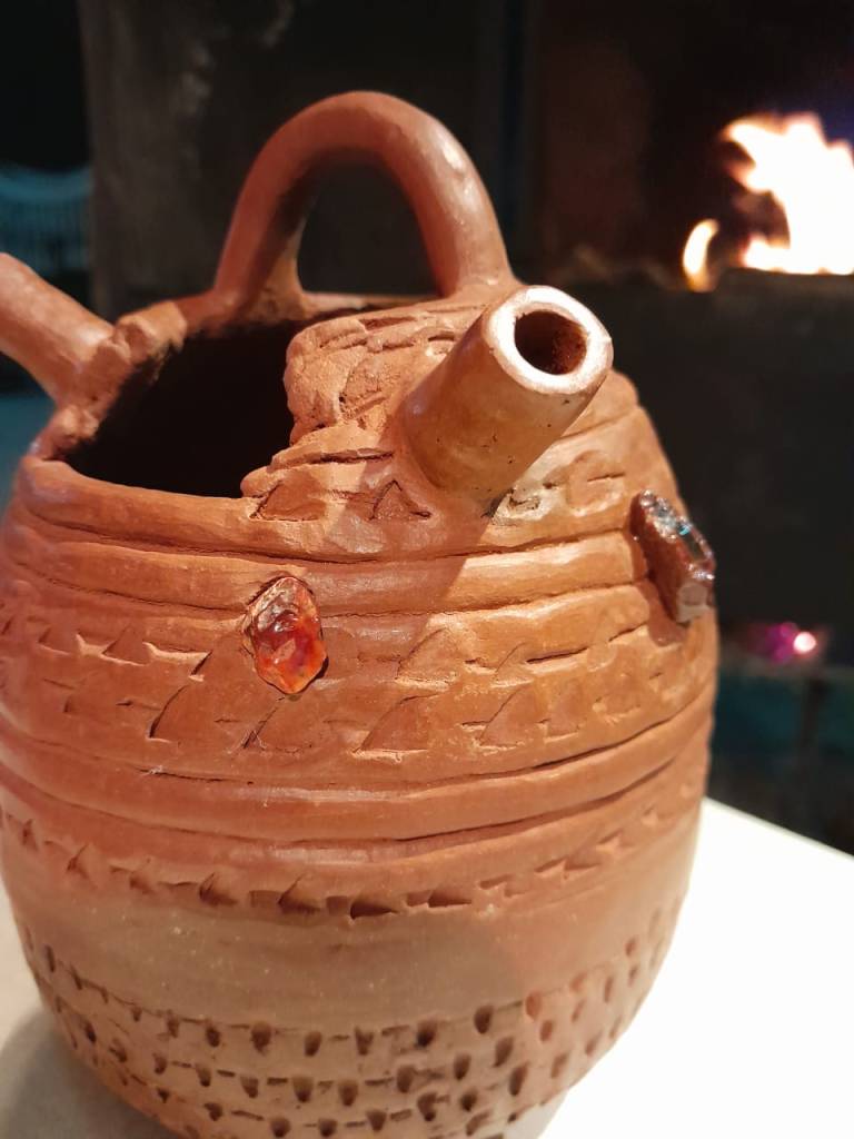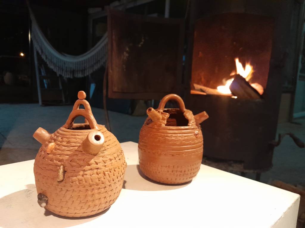Son estos restos lo que vuelven al presente en estas piezas, donde se recrean las asas zoomorfas, los utensilios, las formas hibridadas con la cultura criolla donde aparecen los cambuchíes (antiguas tinajas de dos picos con un asa, que se usaba para enfriar la bebida en los pozos de agua), reutilizados como macetas con plantas colgantes. El río convida pequeñas piedras, que recojo en la orilla, donde comienza toda obra, y se incrustan en sus piezas en su etapa final, como si fueran tesoros.