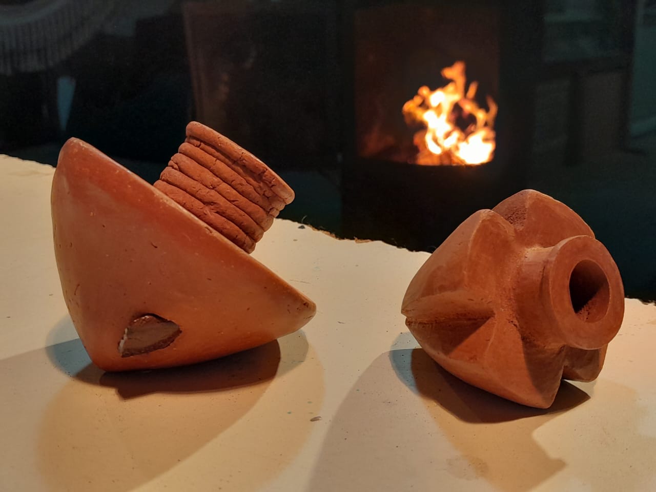 Técnica: cerámica con barro de Itatí, Volumen ahuecado pegado con mucílago de aloe, bruñido con semillas de curuguai y piedras lisas de cuarzo, quemada a 900 grados centígrados a leña. Incrustación de piedras.