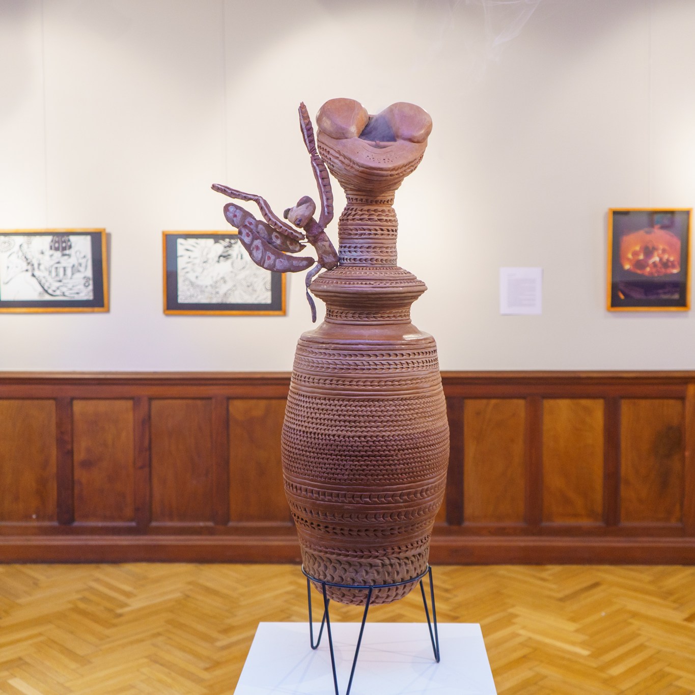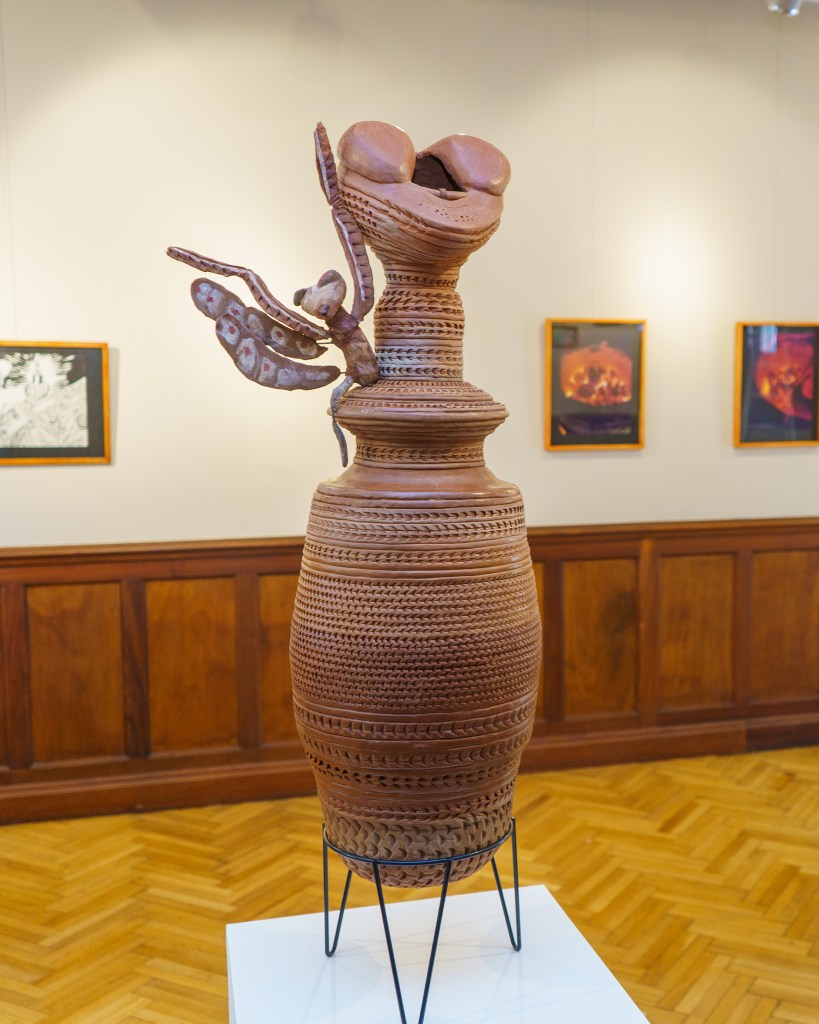 Ingrid abre su figuración a seres inclasificables, que incorporan maderas, vestigios del paisaje. Richar da forma con el barro de su tierra, Itatí, a antiguas tipologías de la alfarería guaraní que se vuelven en estos tiempos objetos voladores, seres en mutación.