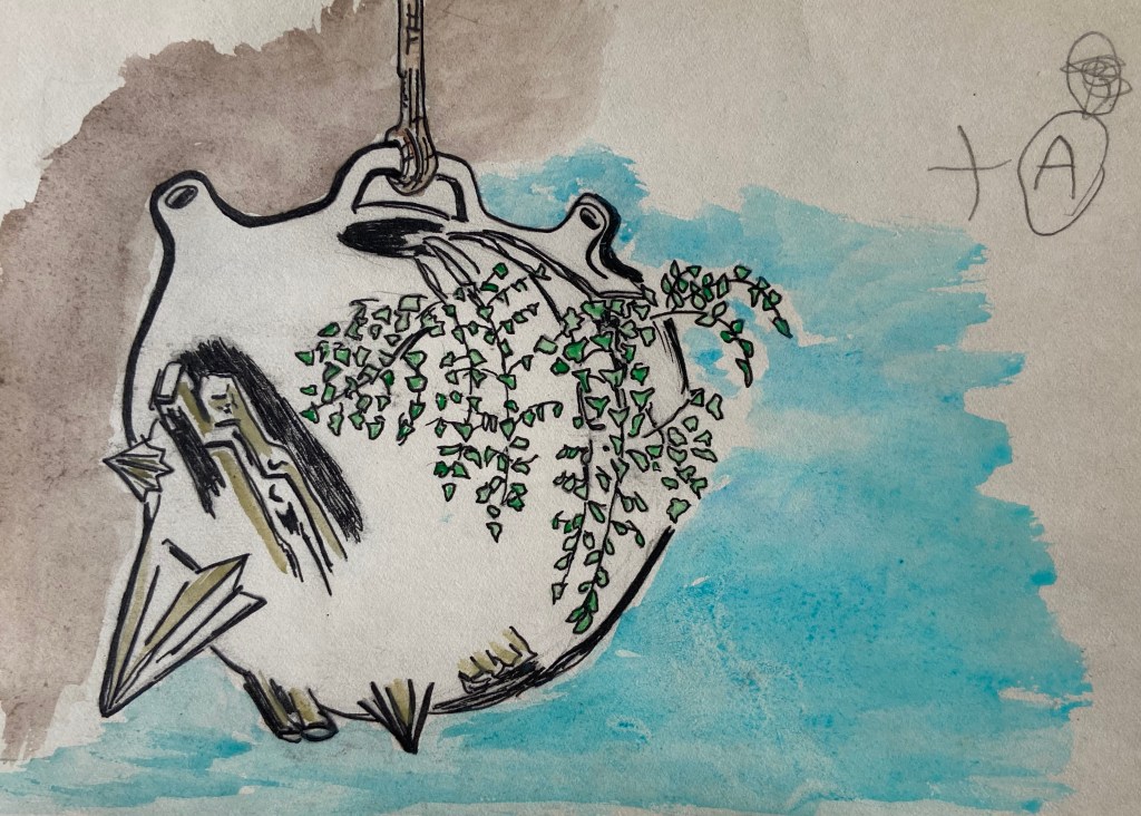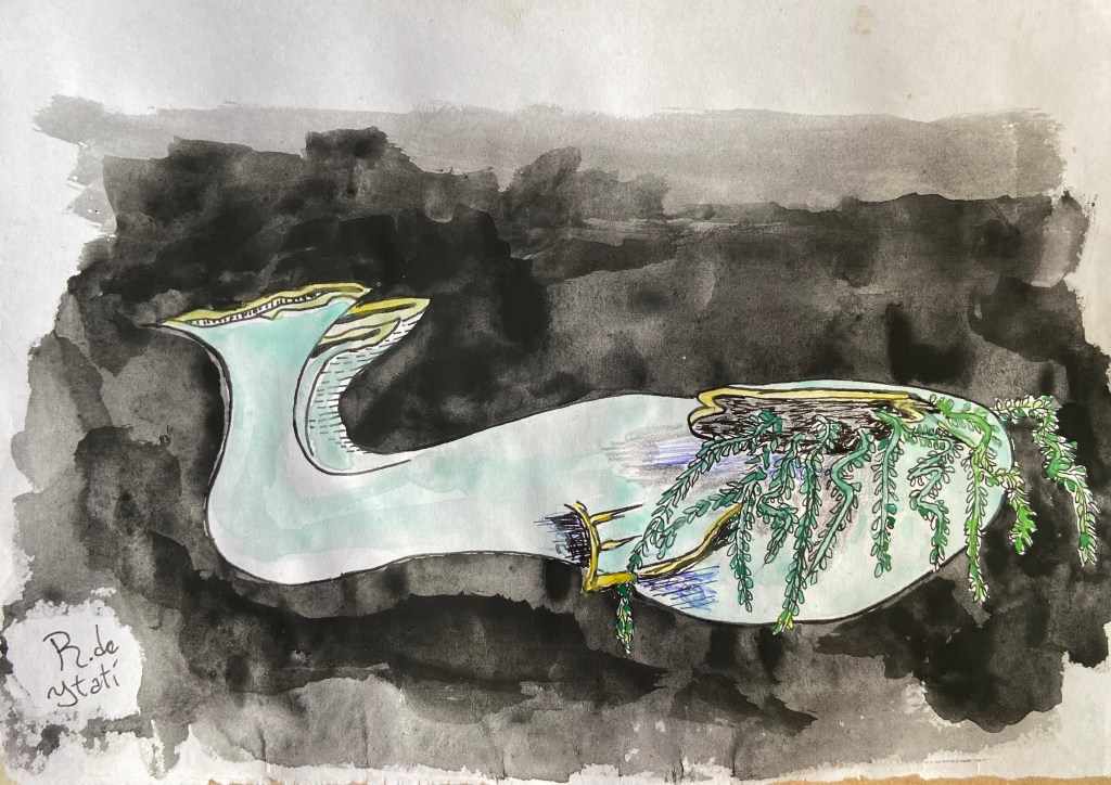 Esta serie de acuarelas y tintas son a veces el germen de obras que luego toman cuerpo en cerámica, pero no siempre son bocetos. A veces, el dibujo llega después de la pieza tridimensional, como un desarrollo independiente. Las imágenes están en la cabeza del artista y van surgiendo en diferentes soportes. La idea ronda su mente y se manifiesta en distintos peldaños en una escalera. Páginas que se pasan en un mismo libro. Son un golpe de imagen instantáneo que solo da la bidimensión.