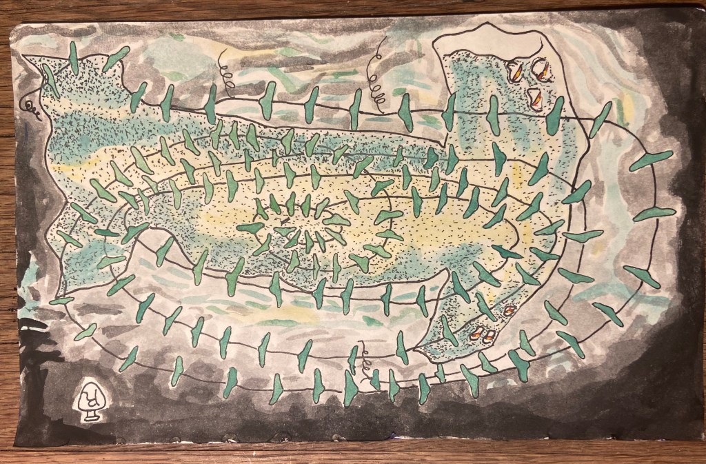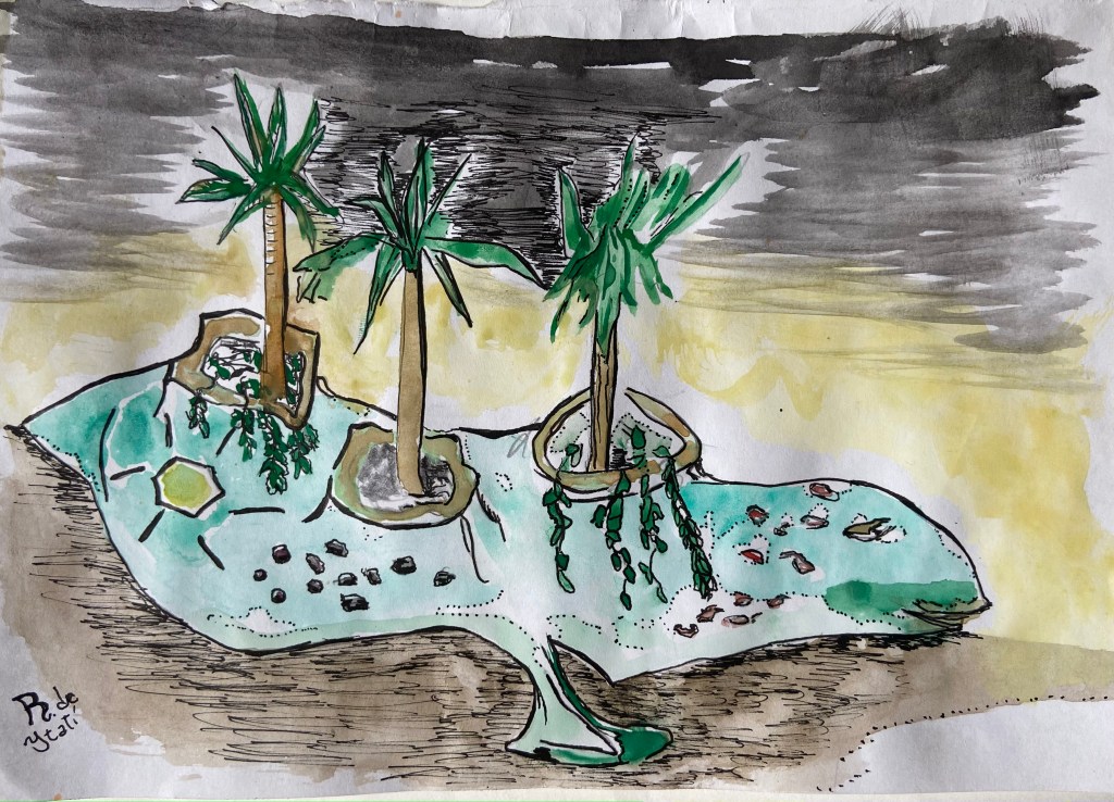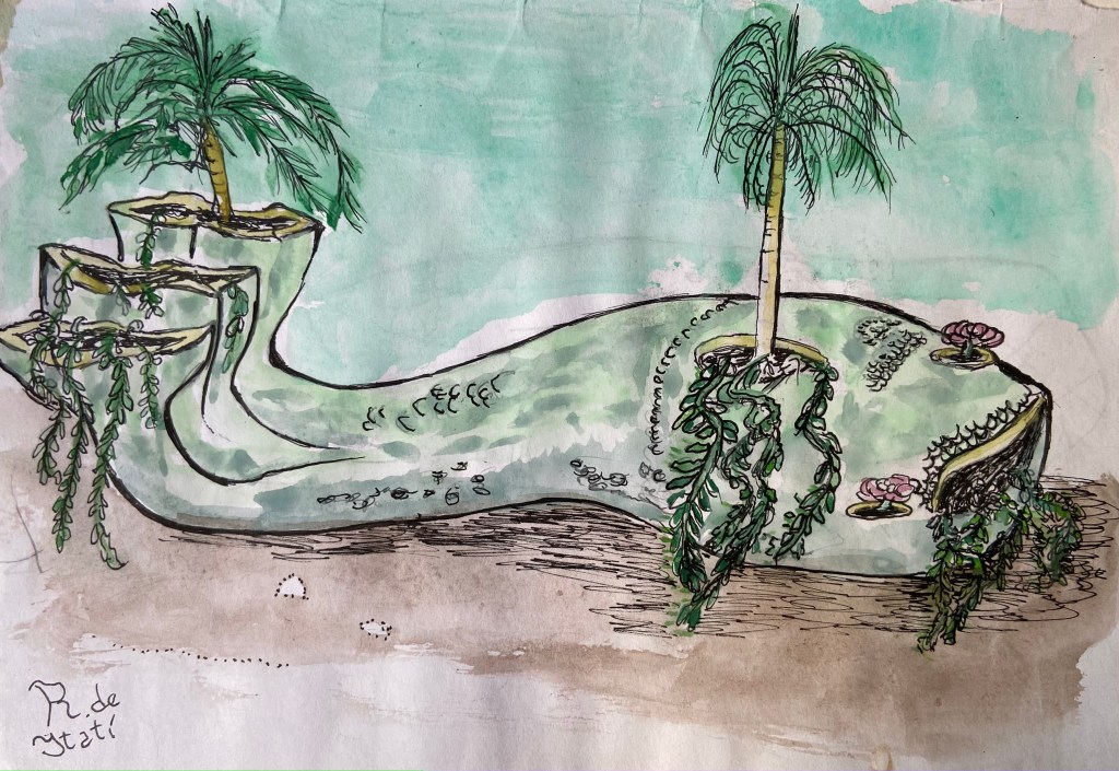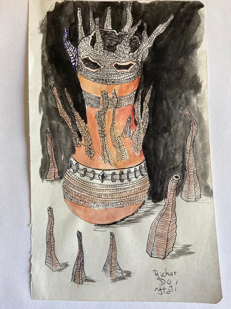 Para dejar de lado la idea inexorable de un futuro infernal y un presente restrictivo, estos seres tienden un puente en dirección contraria al horizonte de la distopía. Los tótems, un intento por dominar el miedo a los dioses desconocidos: moderar su poder en una imagen, aquietarlos, contentarlos… volverlos cercanos. Amigables. Los monstruones, una evolución o adaptación en la que perviven plantas, minerales y animales. Las imágenes de los futuros posibles modelan aquello que nos importa en el presente. Si en vez de tierras arrasadas y androides desalmados concebimos otro horizonte, vivimos el hoy de otra manera, valorando aquello que una imagen nos señala como un porvenir posible. Estos entes guaraníes inventan un destino diferente, donde la evolución implica volver sobre los saberes ancestrales y aquello que tienen de bueno. Es la posibilidad que estas esculturas y acuarelas abren: la de soñar con un futurismo indígena guaraní.