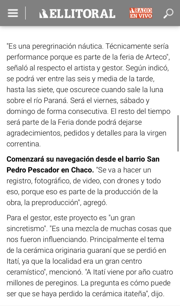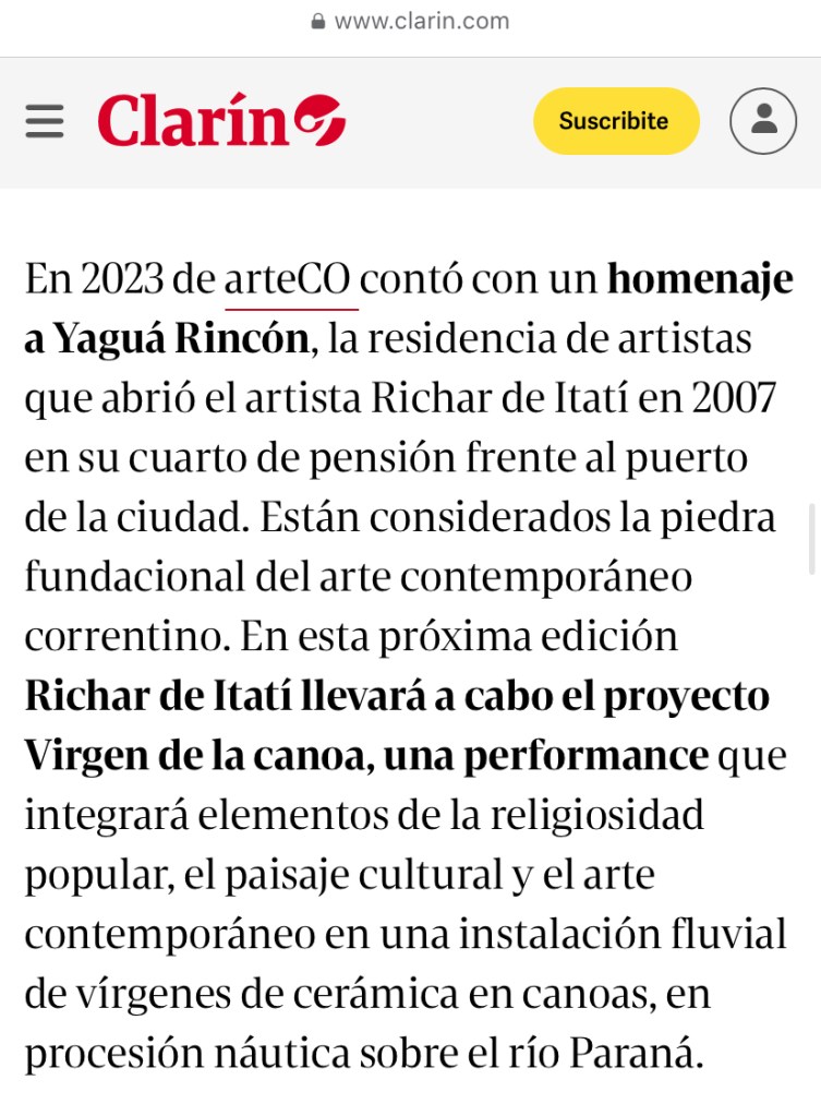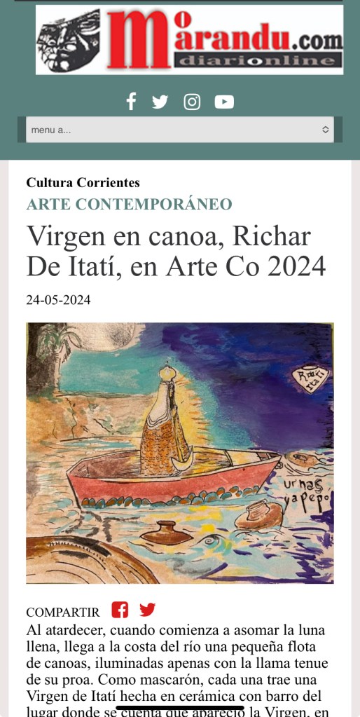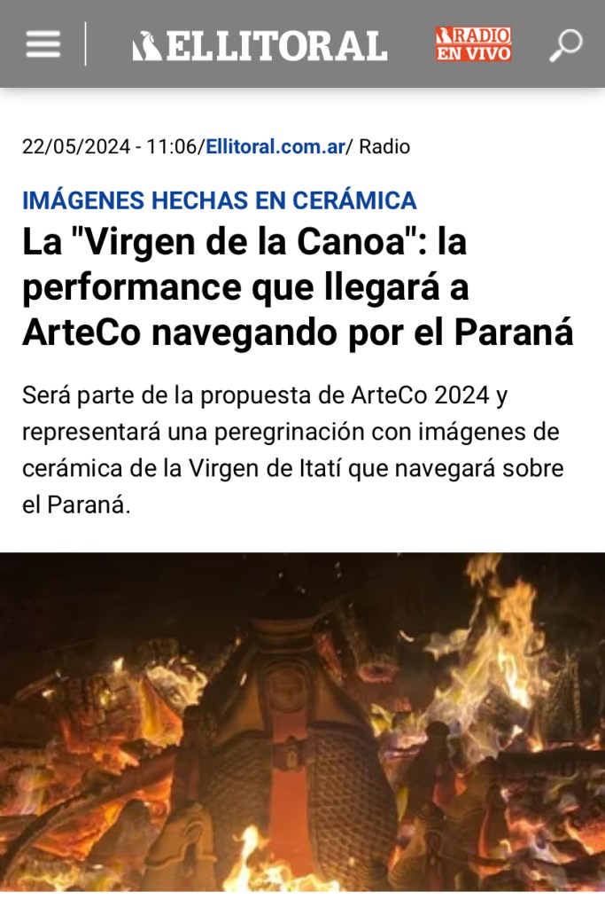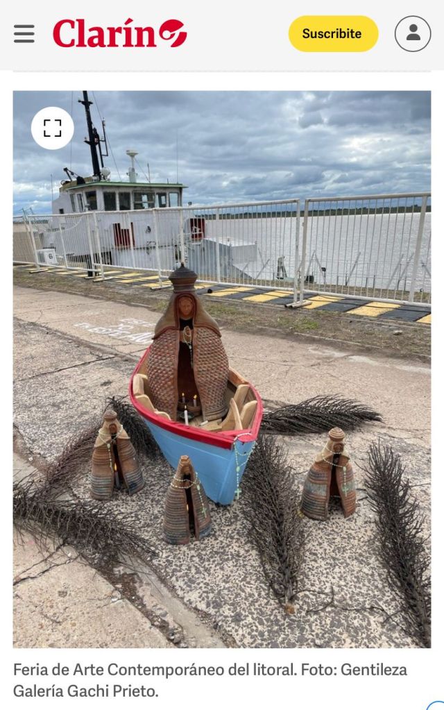 Lo primero que encontraban los visitantes de ArteCo al ingresar al Puerto de Corrientes era una canoa celeste, con una virgen de Itatí de cerámica guaraní hecha con barro de Itatí de más de un metro de alto. El artista Richar De Itatí, su creador, le encendía velas y conversaba con el público sobre su obra. Todos querían sacarse fotos con la Virgen de la Canoa: el gobernador Gustavo Valdez, los prefectos que cuidan el predio, los visitantes y coleccionistas, los niños que querían subirse, los religiosos o los practicantes de otras religiones. Todos se detenían en la particular virgencita, escoltada por vírgenes más pequeñas. Los medios se hicieron eco con notas y fotos en La Nación, Clarin, El Litoral, Momarandu, radio y televisión. Es sin dudas la pieza más fotografiada de la exposición.