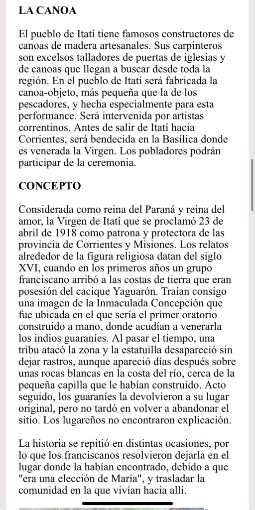 El pueblo de Itatí tiene famosos constructores de canoas de madera artesanales. Sus carpinteros son excelsos talladores de puertas de iglesias y de canoas que llegan a buscar desde toda la región. En el pueblo de Itatí fue fabricada la canoa-objeto, más pequeña que la de los pescadores, y hecha especialmente para esta performance. Antes de salir de Itatí hacia Corrientes, el artista llevó la canoa y las vírgenes a bendecir en la Basílica donde es venerada la Virgen, por el padre José Maciel, también oriundo de Itatí.
