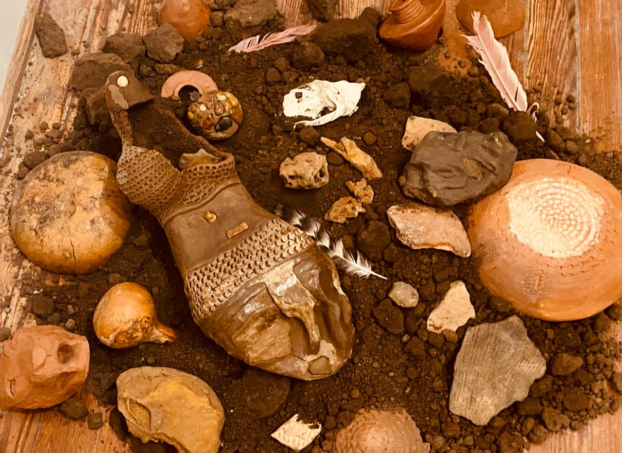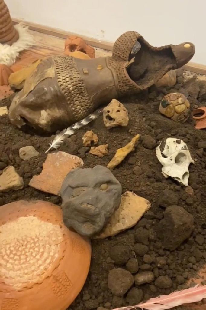 La Venus cerámica esta rodeada por plumas de garza, un cráneo de mono, una piedra con forma de cráneo de mono, una cabeza de yaguareté en cerámica, mini urnas funerarias, porongos, piedras cornalinas y restos arqueológicos reales y ficticios, sobre un montículo de tierra.